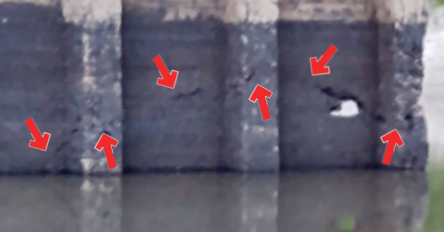 Una fractura ininterrumpìda (señalada en ampliación con flechas rojas) afectaría desde el primero, el cual pareciera erosionado, sin embargo literalmente “estalló” por soportar el peso ante la debilitación provocada al conjunto por la rajadura destacada, involucrando al menos 4 de los pilares, considerando el punto no visible debajo de la línea del agua.